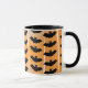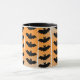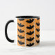 Coffee mug for Halloween with my design of flying black bats on an orange and white background.
