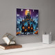 Four cheerful bears in wizard hats hold glowing pumpkins, set against a spooky castle and a full moon on a chilly Halloween night.