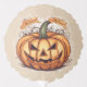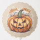Digital design featuring a big pumpkin. This combination of pumpkin, grimace, and Halloween banner is a popular decoration during the fall and Halloween season. A classic symbol for the spooky time of year.