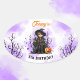 Halloween Birthday small gable favor boxes for little girls with a cute little witch and pumpkin in purple, black and orange. Easily personalize all the text. You can choose from 3 sizes of these gable favor boxes - Kate Eden Art