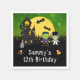This fun and spooky plate features cute Frankenstein monsters beside a crooked haunted house. In the background is a full moon with bats and a green night sky with stars. This is perfect for a Halloween themed birthday party.