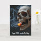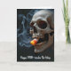 A realistic skull is depicted with a candy corn tucked between its teeth, exuding an eerie yet whimsical aura.