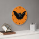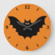 Large Round Wall Art Clock and home furnishing decor accessory with Halloween Black Bat artwork design image by TheFabricSeal at Zazzle.com is a cute and simple lone black bat illustration art drawing silhouette style with peekaboo peering khaki green and pumpkin orange eyes looking out for friends and prey alike and a cool dark Halloween night of adventure, goblins, ghouls, and trick or treat sweets.