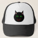 This awesome hat features a black cat with pointed ears, bright green eyes and a sly red grin. This creepy kitty is perfect for Halloween or for cat lovers.