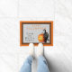 Halloween door mat has a black cat next to a Jack O'Lantern. Edge of mat is orange with two black borders. Typography says Happy Halloween and then you personalize with your family name.