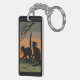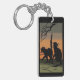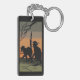 This image portrays 2 black cats with glowing eyes standing on a patch of grass under a branch of a dead tree. The sky in the back is an orange, and light black color. A black border was added. These key chains are available in assorted styles and sizes.
