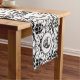 Table runner with an elegant and unique Halloween themed skull pattern design on black and white damask. Matching tableware and home decor available at the ScriptoGraphic Design Store.