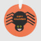 This awesome acrylic ornament features a spooky black spider with eight hairy legs, yellow eyes with big black pupils and its mouth open showing its fangs. There is orange text that reads “Happy Halloween” and a matching orange background.