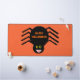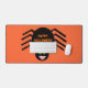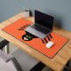 This awesome desk mat features a spooky black spider with eight hairy legs, yellow eyes with big black pupils and its mouth open showing its fangs. There is orange text that reads “Happy Halloween” and a matching orange background.