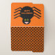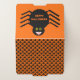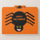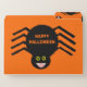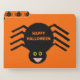 This awesome set of file folders features a spooky black spider with eight hairy legs, yellow eyes with big black pupils and its mouth open showing its fangs. There is orange text that reads “Happy Halloween” and a matching orange background.