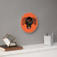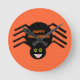 This awesome clock features a spooky black spider with eight hairy legs, yellow eyes with big black pupils and its mouth open showing its fangs. There is orange text that reads “Happy Halloween” and a matching orange background.
