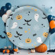 Charming Halloween party paper plates featuring cute ghosts, pumpkins, spiderwebs and bats against a light blue background. Great for children's Halloween costume parties, birthdays or baby shower parties.