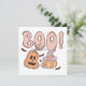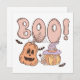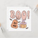 Boo! Halloween Boo design perfect for anyone celebrating the Halloween season, features pink text that reads BOO and has a pumpkin, witch hat, jack o lantern, spider web, and bats!