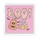 Boo! Halloween Boo design perfect for anyone celebrating the Halloween season, features pink text that reads BOO and has a pumpkin, witch hat, jack o lantern, spider web, and bats!