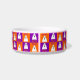 This awesome pet bowl features a cute little white ghost with black eyes and a black mouth that is wide open. Each ghost sits on either an orange colored square or a purple colored square and there is either orange or purple text in each square that says Boo! The result is a pattern of squares and ghosts.