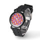 This awesome watch features a cute little white ghost with black eyes and a black mouth that is wide open. Each ghost sits on either an orange colored square or a purple colored square and there is either orange or purple text in each square that says Boo! The result is a pattern of squares and ghosts.