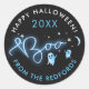 These spooky round stickers feature adorable glowing light blue ghosts, playfully saying "Boo" in cute handwritten calligraphy. The design is set against a deep, dark, starry night sky, with tiny white stars adding a magical glow to the background. Ideal for giving a charming, whimsical touch to Halloween trick-or-treat gifts, these stickers blend spooky fun with a sweet, playful vibe. Perfect for party favors, candy bags, or seasonal decorations, they bring a delightful pop of Halloween spirit to any occasion.