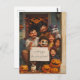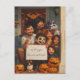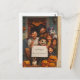 This is a super-cute Halloween postcard to send funny message to your loved ones. In this design there is a family with Halloween costumes and masks sitting on the porch of their house and holding a white banner with a customizable text.
