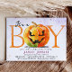 Plain white envelopes are included with paper invitations and will come to fit the invitation size you select. If you don’t need the envelopes, you may choose to not receive them by selecting the dropdown below "Envelopes" and choosing "None." If you’d like to have a design on your envelopes, you can browse all of these available envelopes to find the design that complements your Halloween Boy Baby Shower Invitation.