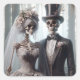 A skeletal bride and groom dressed in wedding attire complete with floral accessories and a top hat set against a misty moss forest backdrop