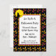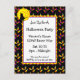 A custom postcard invitation with a background pattern of candy corn, a witch and room for your custom party details in black scripty letters. Click Customize it to change fonts, sizing, text and more, even save your design for later.