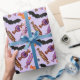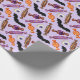 A delicious Halloween gift wrap design featuring illustrations of various Halloween candies including eyeball gumballs, gummy bats, and swirly striped hard candy in orange, purple and black colors.