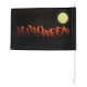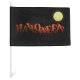 A car flag with a Halloween theme, featuring a black background with the word "Halloween" in orange, 3D-style lettering. Above the word, there's a full moon and a silhouette of a cat and a bat. The flag is attached to a white plastic pole with a clip at the bottom.
