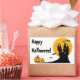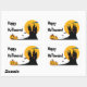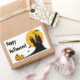 A customizable set of rectangle stickers with the words "Happy Halloween!" and a castle silhouette against a beautiful full moon with clouds and bats and two Halloween pumpkins.