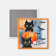 Cute picture of two, black cats with pumpkins and bats, is featured on this magnet for Halloween. Message on magnet, "Happy Halloween", makes this a cute decoration for home or the office for Halloween. Makes a great little gift too!
