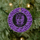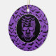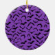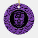 Halloween party ceramic ornament is shown with a spooky skull print on a bats purple color background.