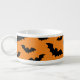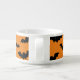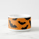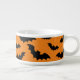 Halloween chilly bowl with spooky bats pattern. Orange and black design.