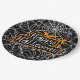 A Happy Halloween Paper Plate In Black With White Cobwebs And Orange Bats For Halloween Parties
