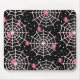 A mouse pad with a cute seamless pattern with white cobwebs and pink spiders.