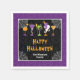 This fun and spooky napkin features Halloween themed cocktails with decorations such as a witch's hat, broomstick and cauldron, ghost, bat, pumpkins and eyeballs. In the background is a black and purple damask pattern with spider webs. The text combines decorative and serif fonts for a stylish and modern look. This is perfect for a Halloween fancy dress costume party.