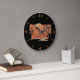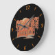 Large Round Wall Art Clock and home furnishing decor accessory with Halloween Creepy Haunted House By http://www.thefabricseal.zazzle.com is a spooky looking color pencil drawing illustration of a scary haunted house mansion. The autumn fall colored foliage leaves, big tall trees and large wooden craftsman style house are glowing with the night light from the full harvest yellow golden orange moon in the background illuminating another fun and scary Halloween evening night full of goblins, ghouls and trick or treaters wondering throughout the town.