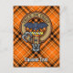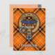 Halloween crest badge with flying bat surrounded by a strap and buckle over tartan background. Custom text. Custom back message.