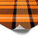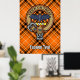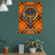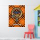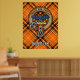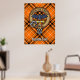 Halloween crest badge with flying bat surrounded by a strap and buckle over tartan background. Custom text.