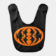 This awesome baby bib features an orange oval with six crows in it. Each crow has yellow eyes with black pupils and outstretched wings. The crows are flying towards each other forming an oval shape. The background is black.