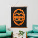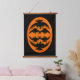 This awesome wood topped wall tapestry features an orange oval with six crows in it. Each crow has yellow eyes with black pupils and outstretched wings. The crows are flying towards each other forming an oval shape. The background is black.