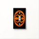 This awesome light switch cover features an orange oval with six crows in it. Each crow has yellow eyes with black pupils and outstretched wings. The crows are flying towards each other forming an oval shape. The background is black.