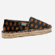 This awesome pair of espadrilles features an orange oval with six crows in it. Each crow has yellow eyes with black pupils and outstretched wings. The crows are flying towards each other forming an oval shape. The background is black.