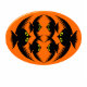 This photo sculpture features an orange oval with six crows in it. Each crow has yellow eyes with black pupils and outstretched wings. The crows are flying towards each other forming an oval shape. .