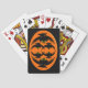 This awesome deck of playing cards features an orange oval with six crows in it. Each crow has yellow eyes with black pupils and outstretched wings. The crows are flying towards each other forming an oval shape. The background is black.