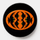 This awesome phone grip features an orange oval with six crows in it. Each crow has yellow eyes with black pupils and outstretched wings. The crows are flying towards each other forming an oval shape. The background is black.