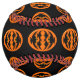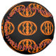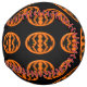 This awesome softball features an orange oval with six crows in it. Each crow has yellow eyes with black pupils and outstretched wings. The crows are flying towards each other forming an oval shape. The background is black.