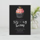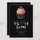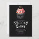 At the top of the invitation, a super cute Halloween cupcake steals the show. The cupcake, set in a black and white holder, is topped with pink frosting and sprinkled with black and white details, adding a sweet and whimsical touch to the spooky theme. Topping it all off is a black jack-o'-lantern decoration, bringing a perfect mix of festive fun and Halloween charm to the invitation.