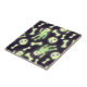 Drawings of a cute spooky skeleton, bones, and skulls that look like greenish glow in the dark color on a dark purple black background and purple space stars in their eyes. They are arranged in a non-directional all-over halloween pattern. Please note this print does not actually glow in the dark, it's just artwork that I made to resemble glow in the dark.