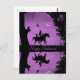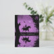 Happy Halloween postcard with a witch and her familiars. This is a magical mystical and whimsical Happy Halloween. A witch riding a unicorn on a starry night framed by an oak tree with a crescent moon. A cat rides with her as she holds a raven with one flying by and an owl just watches over. A pond of water reflects perfectly. Done in the mystical purple color. A fun mystical magical whimsical way to send Happy Halloween wishes.