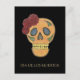 Halloween Day of the Dead postcard, with a black and gold design and a sugar skull image. With gold typography lettering, you can customize this item with your own information. Great for sending well wishes to your friends to celebrate Halloween and Dia de los Muertos .