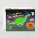Spooky Dinosaur Happy Halloween Cut & Glue PaperCraft Postcard. Make your own unique Halloween cartoon dinosaur with orange pumpkin stautue with this great 3d cut out and glue card! A cute green Diplodocus dino with a blue wizard hat with yellow stars and a big orange pumpkin and a clouded dark sky with full moon and flying bats, purple flying Pteradonon dino and spooks and a haunted house front text "Happy Halloween". Easy to make, just cut and glue and your green dino paper stand is ready to put in your window, desk or on your bedroom dresser! This spooky Halloween papercraft card is fully customizable, add your texts and images! A very special and unique Halloween handout card!